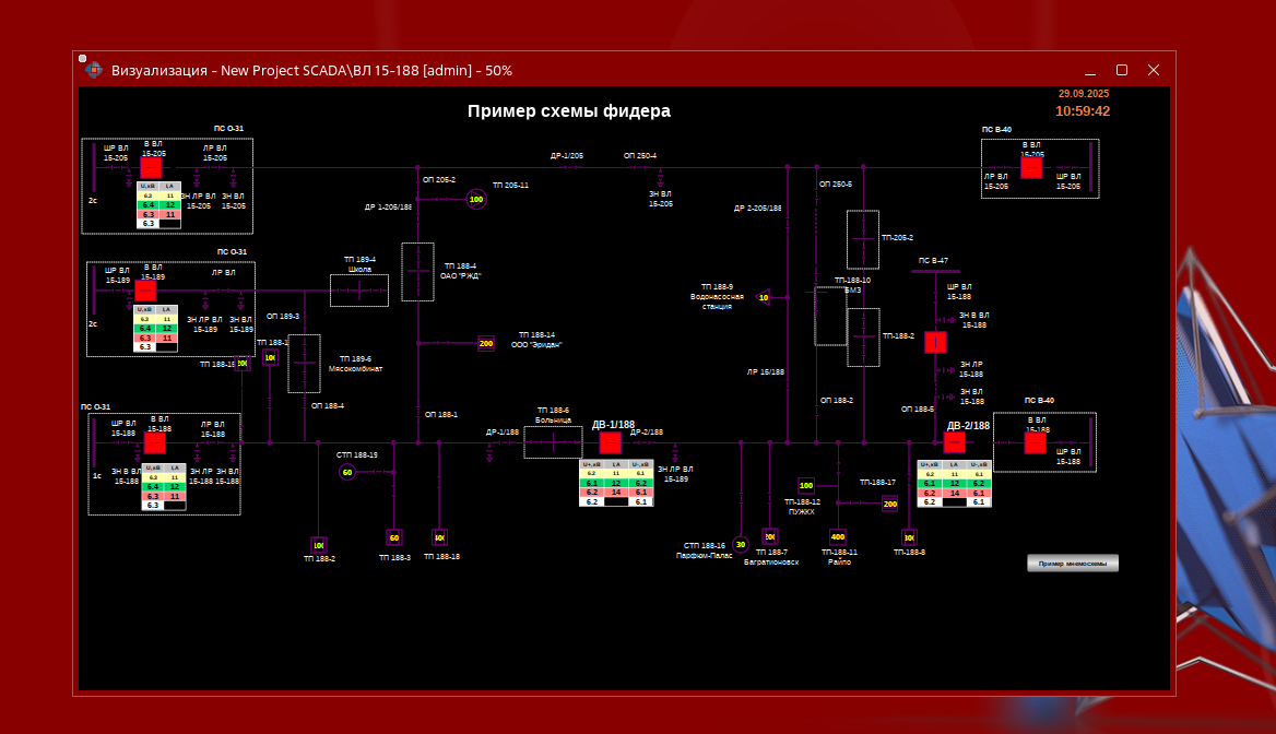 Эффективный векторный графический движок обеспечивает свободное масштабирование мнемосхем и быстрый скроллинг мнемосхем большого размера.