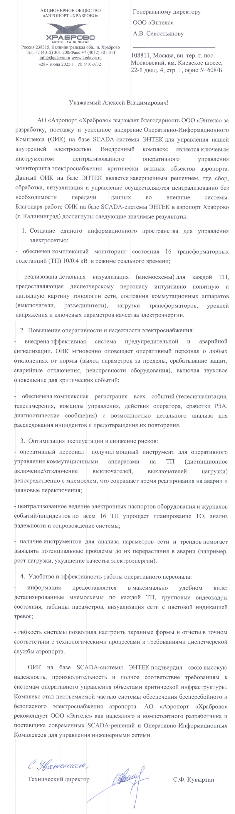 АО «Аэропорт «Храброво» выражает благодарность ООО «Энтелс» за разработку, поставку и успешное внедрение Оперативно-Информационного Комплекса (ОИК) на базе SCADA-системы ЭНТЕК для управления нашей внутренней электросетью. Внедренный комплекс является ключевым инструментом централизованного оперативного управления мониторинга электроснабжения критически важных объектов аэропорта. Данный ОИК на базе ЭНТЕК является завершенным решением, где сбор, обработка, визуализация и управление осуществляются централизованно без необходимости передачи данных во внешние системы. Благодаря работе ОИК на базе SCADA-системы ЭНТЕК в аэропорт Храброво (г. Калининград) достигнуты следующие значимые результаты: