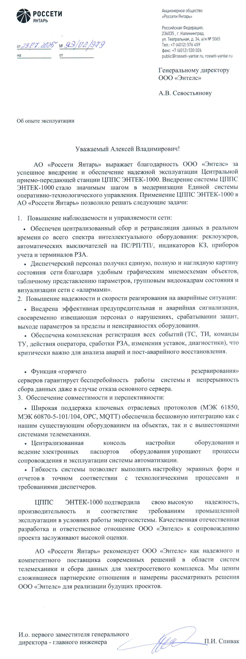 АО «Россети Янтарь» рекомендует ООО «Энтелс» как надежного и компетентного поставщика современных решений в области систем телемеханики и сбора данных для электросетевого комплекса. Мы ценим сложившиеся партнерские отношения и намерены рассматривать решения ООО «Энтелс» для реализации будущих проектов.